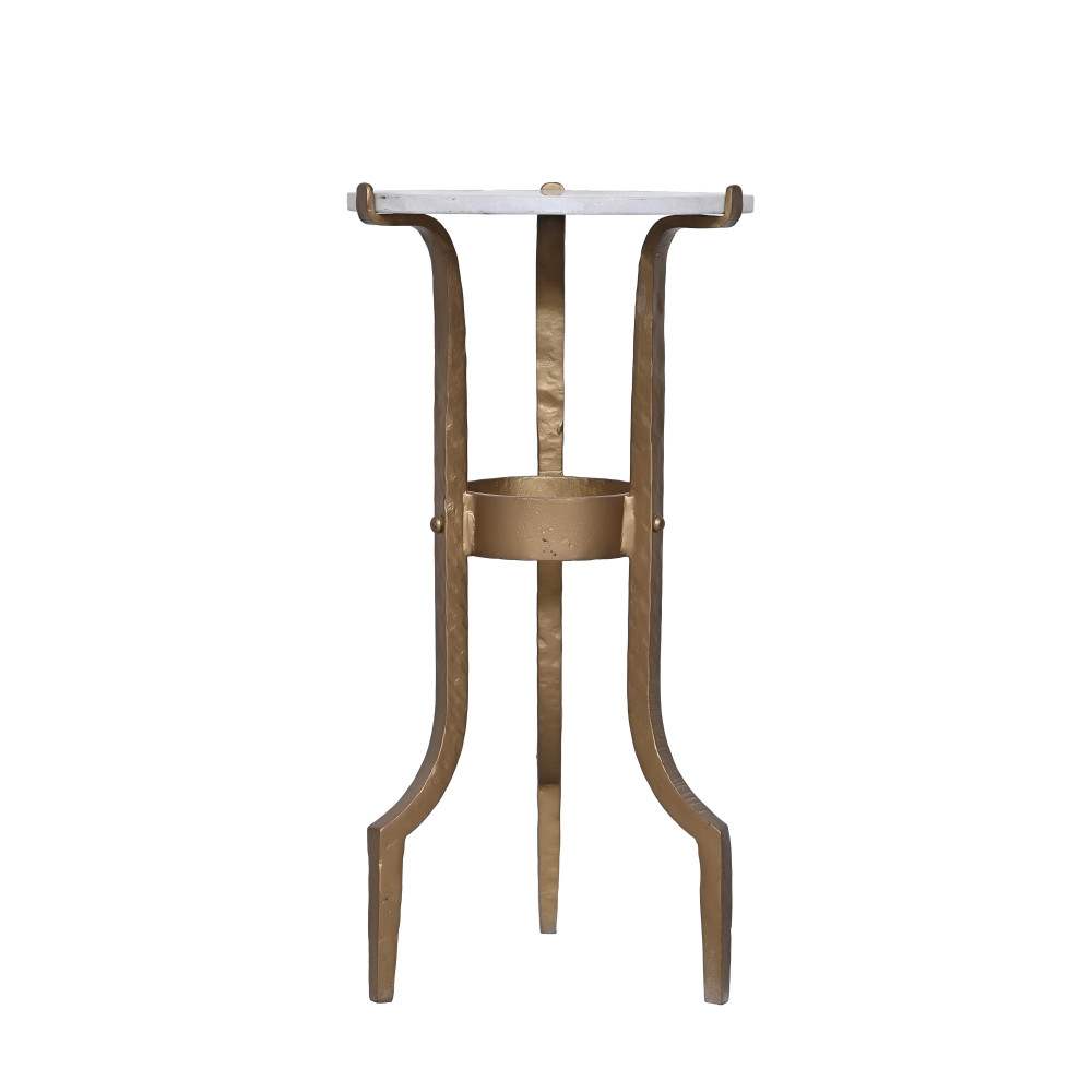 A striking blend of artistry and function, this side table brings a touch of modern glamour to any space. Featuring a round white top paired with a sculptural gold metal base, it stands out as both practical and decorative. Perfect as a chic companion to your sofa or bedside, this table is ideal for displaying décor, serving drinks, or simply elevating the aesthetic of your interiors.
