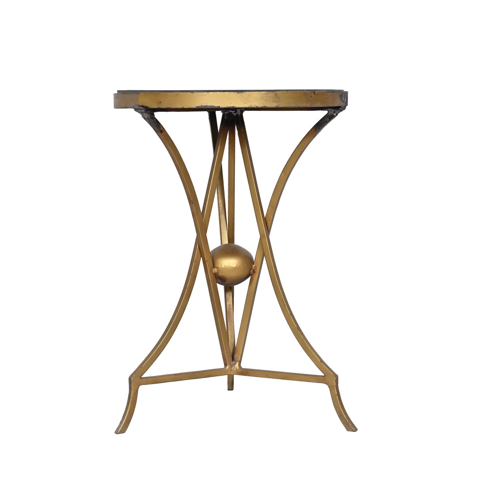 A striking blend of artistry and function, this side table brings a touch of modern glamour to any space. Featuring a sleek round black top paired with a sculptural gold metal base, it stands out as both practical and decorative. The crisscross legs, highlighted by a central golden sphere, create a captivating geometric design that adds depth and sophistication. Perfect as a chic companion to your sofa or bedside, this table is ideal for displaying décor, serving drinks, or simply elevating the aesthetic of your interiors.