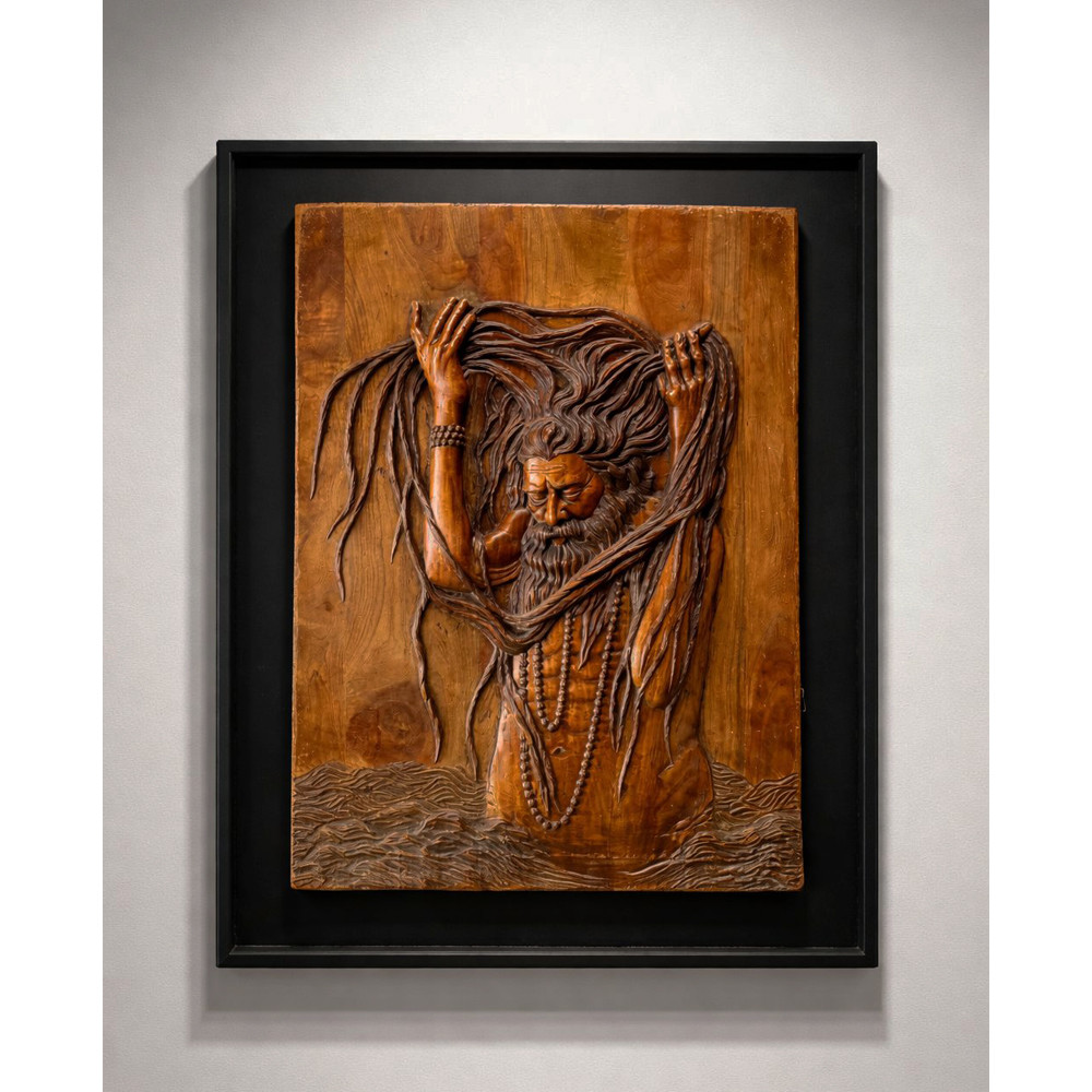 A striking blend of craftsmanship and spirituality, this hand-carved wooden wall mural captures a powerful ascetic figure immersed in deep meditation. Intricately sculpted flowing hair, textured beads, and serene expressions bring a sense of movement and life to the piece, while the rich natural wood tones add warmth and depth. Set within a sleek black frame, this artwork creates a bold focal point—perfect for spaces that seek a balance of art, culture, and calm.